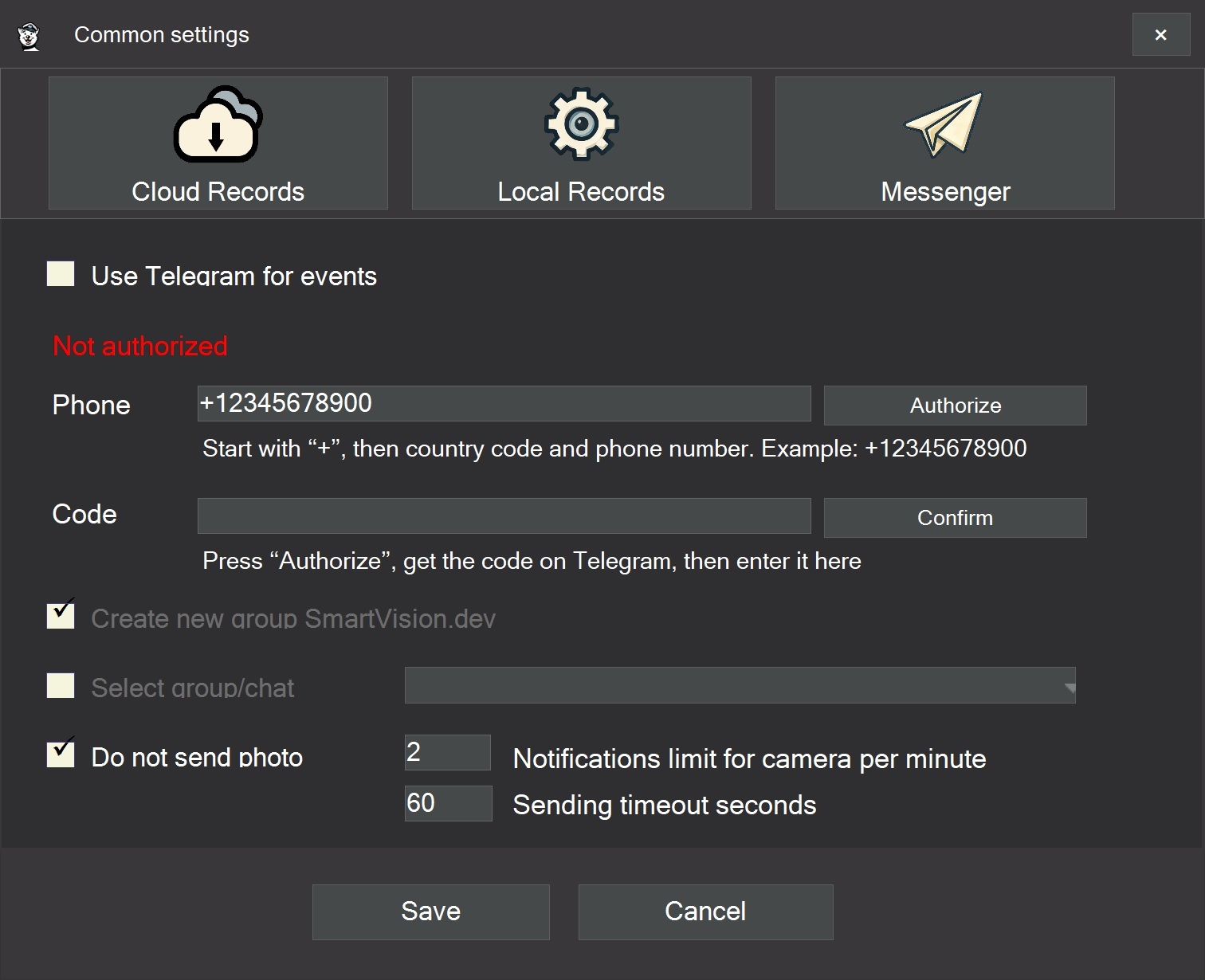 A Telegram connection panel has been added to the general settings. To enable the feature, activate the “Use Telegram for events” option, enter your phone number, and input the verification code received in Telegram. After connection, a group named SmartVision.dev is automatically created where notifications will be sent.