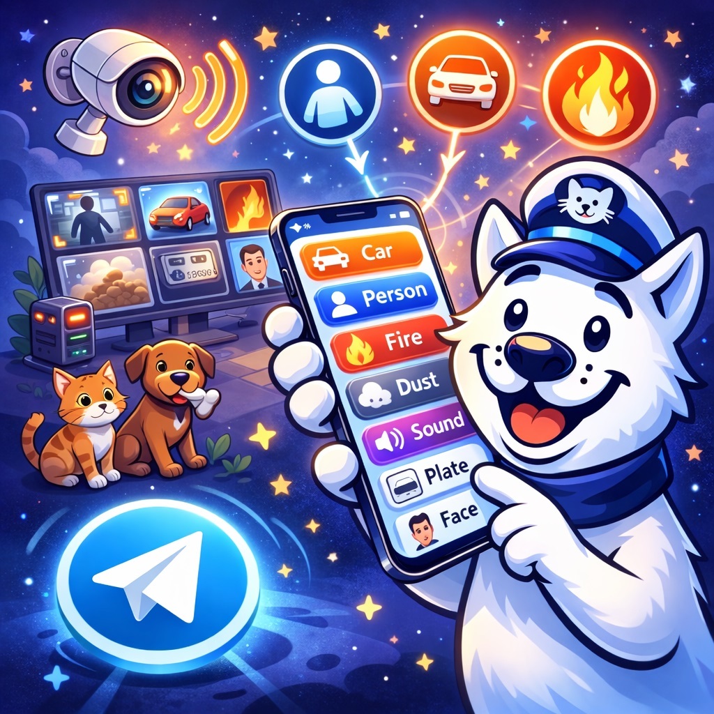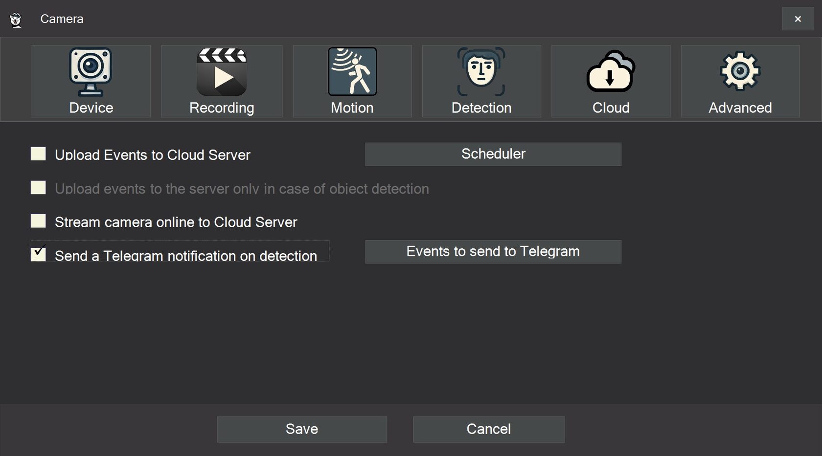 In the Cloud tab of the camera settings, filters for event types have been added. You can select which detected objects should trigger notifications. For example, you may choose to receive alerts only for a person or a car while ignoring animals.
