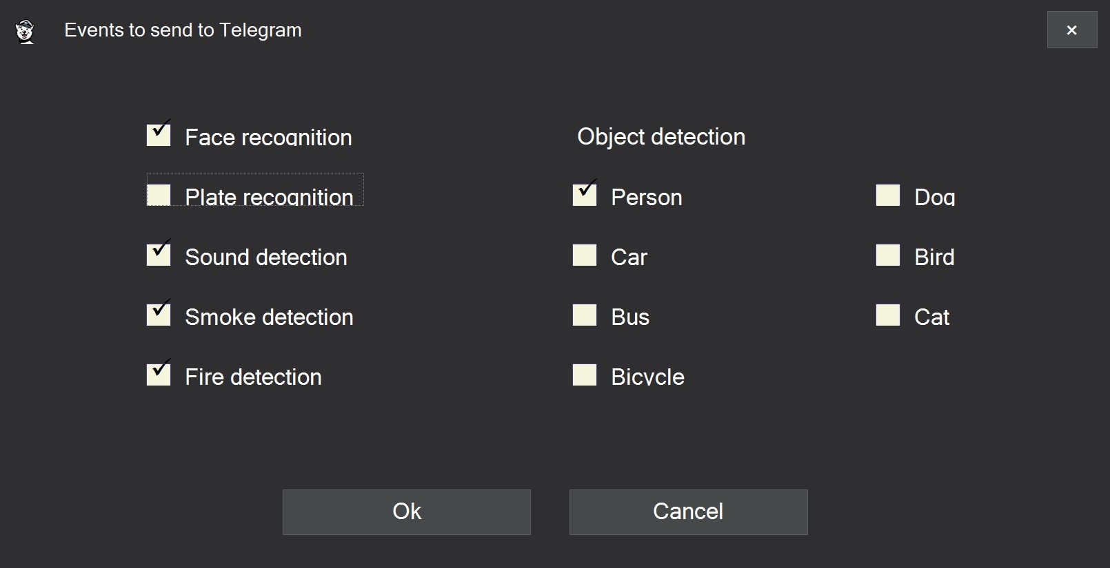 Notifications are generated based on detected object types. These include person, dog, car, fire, smoke, sound, and other categories. Events can also be triggered by recognition of specific license plates or specific faces from the database.